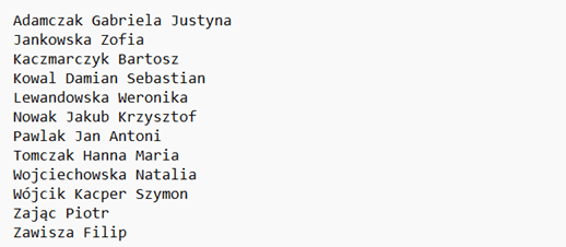 Druga uwaga jest taka, że w poszanowaniu tych właśnie danych nie używam prawdziwych imion ani nazwisk uczniów żadnej klasy, tylko kombinacji najbardziej w Polsce popularnych. Oczywiście do wygenerowania listy również używam AI. Żadna osoba na niej nie jest więc prawdziwa, a ewentualna (i bardzo skądinąd prawdopodobna) zbieżność z danymi realnych osób jest całkowicie przypadkowa.