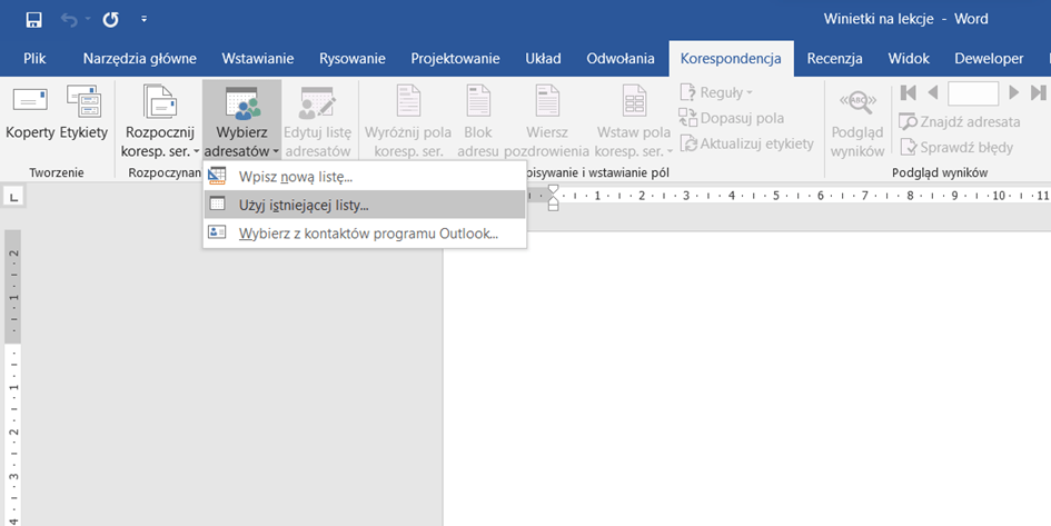 Krok 4. Najpierw połączymy dokument tekstowy ze źródłem danych. W głównym menu wybieramy Korespondencja następnie Wybierz adresatów i klikamy na Użyj istniejącej listy.
