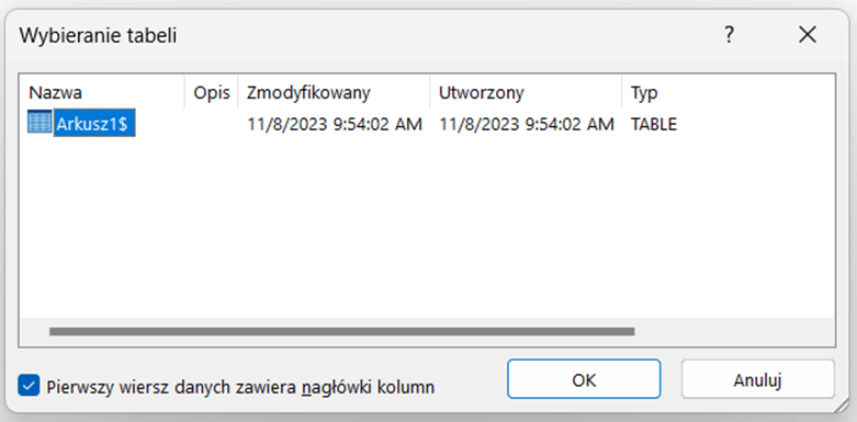 W kolejnym oknie wybieramy arkusz w którym znajdują się dane i w naszym przypadku zaznaczamy opcję Pierwszy wiersz zawiera nagłówki kolumn.