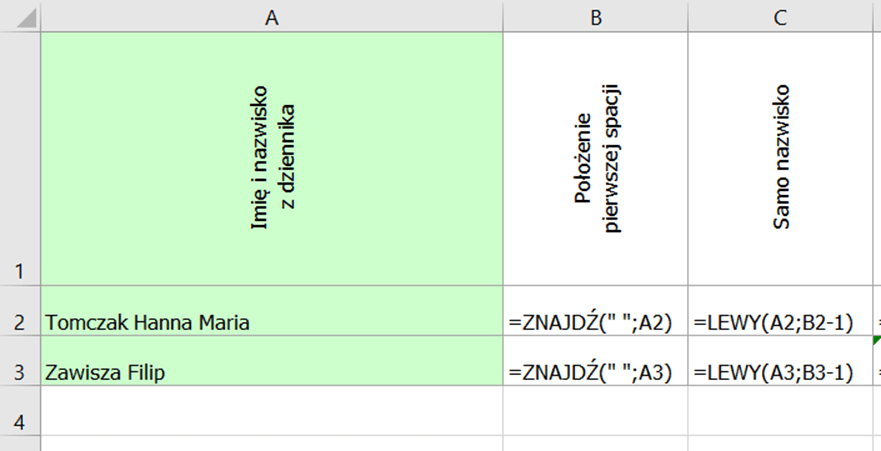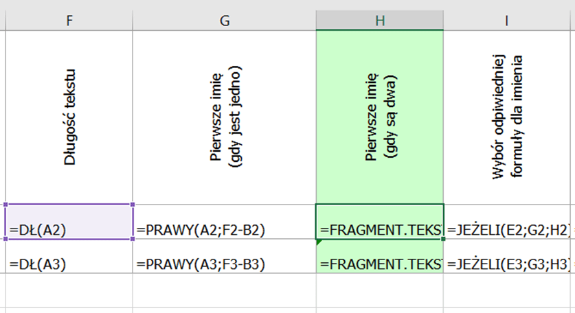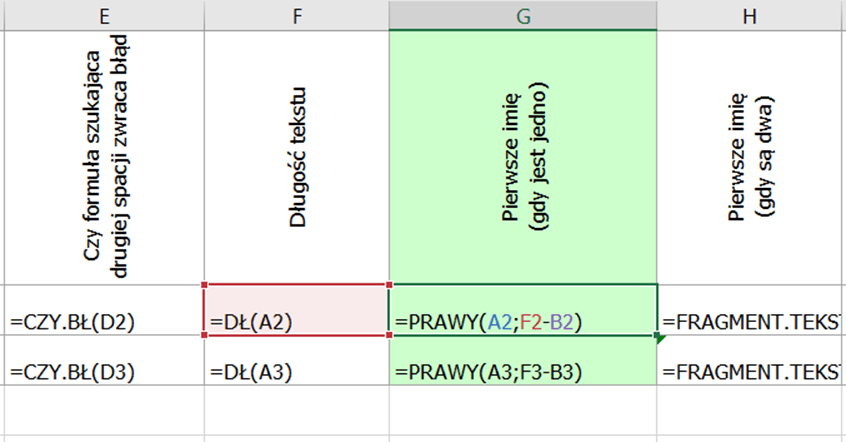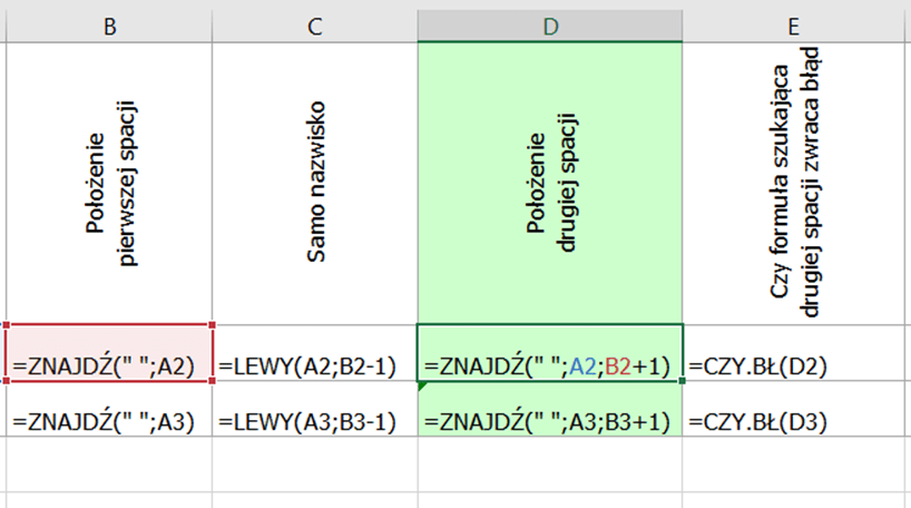 =JEŻELI(CZY.BŁ(ZNAJDŹ(” „;A2;ZNAJDŹ(” „;A2)+1));PRAWY(A1;DŁ(A2)-ZNAJDŹ(” „;A2));FRAGMENT.TEKSTU(A2;ZNAJDŹ(” „;A2)+1;ZNAJDŹ(” „;A2;ZNAJDŹ(” „;A2)+1)-ZNAJDŹ(” „;A2)-1))