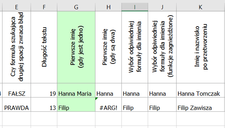 Ta formuła nie będzie oczywiście działała prawidłowo dla ucznia, który ma dwoje imion (tak jak w przypadku ciągu znaków Hanna Maria w komórce G2). W przypadku ucznia z jednym imieniem (komórka G3 – Filip) wszystko jest ok i to jest nasz końcowy rezultat.