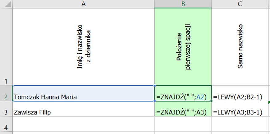 Najłatwiejsze do uzyskania będzie samo nazwisko dla każdego ucznia. W tym celu najpierw ustalimy położenie pierwszej spacji, a później odetniemy od lewej strony ciąg znaków o takiej właśnie długości (spacja minus jeden). W komórce B2 wpisujemy: