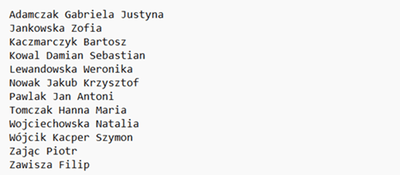 Mamy więc dla każdego ucznia odseparowane jego nazwisko (w kolumnie C) i pierwsze imię (dla uczniów z jednym imieniem w kolumnie G, a dla uczniów z dwoma imionami w kolumnie H).
