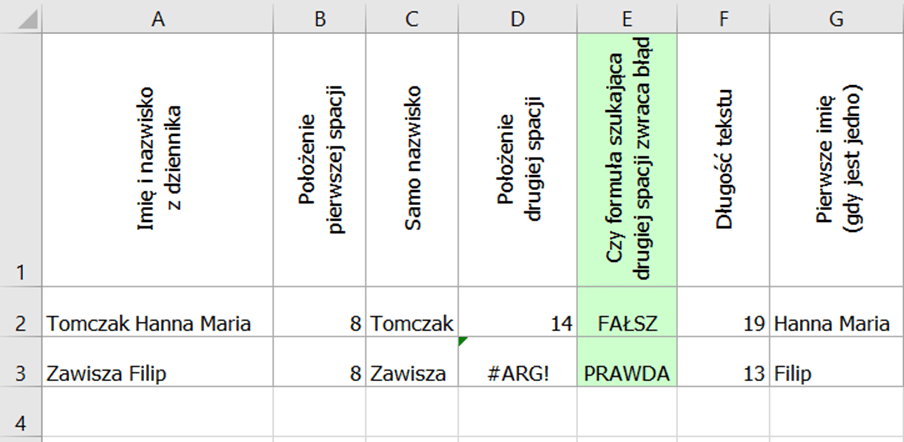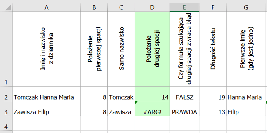 Zaczynamy od sprawdzenia czy dany uczeń ma jedno imię czy dwa. Można to zrobić na kilka sposobów ale najłatwiej będzie wykorzystać do tego wartości w kolumnie D wskazującej położenie drugiej spacji w ściągniętym z dziennika ciągu znaków. Gdy uczeń ma tylko jedno imię, drugiej spacji nie będzie i w komórce pojawi się błąd. Widać to na poniższym screenie: