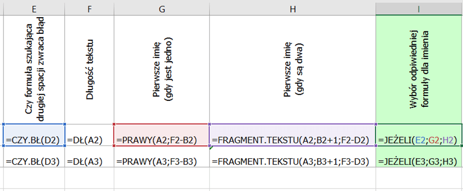 =JEŻELI(CZY.BŁ(ZNAJDŹ(” „;A2;ZNAJDŹ(” „;A2)+1));PRAWY(A2;DŁ(A2)-ZNAJDŹ(” „;A2));FRAGMENT.TEKSTU(A2;ZNAJDŹ(” „;A2)+1;DŁ(A2)-ZNAJDŹ(” „;A2;ZNAJDŹ(” „;A2)+1)))