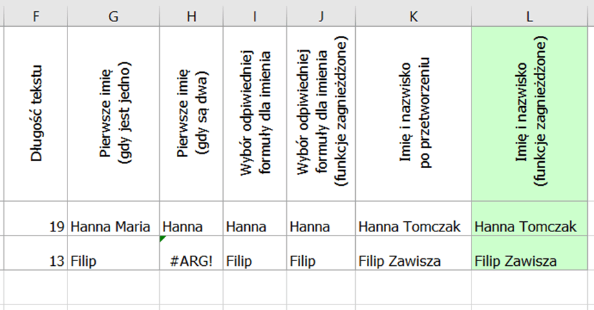 Teraz w zależności od wartości tej funkcji (czyli w zależności od tego ile jest imion) możemy wybrać dane z odpowiedniej kolumny (G lub H).