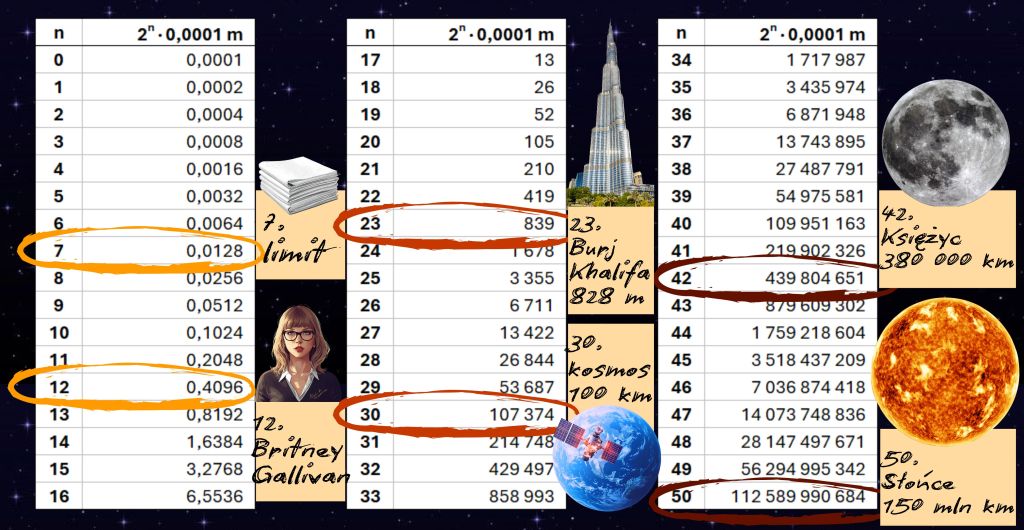 Przyjrzyjmy się sprawie trochę bardziej matematycznie. Gdy zginamy kartkę, jej grubość mnożymy przez 2, potem znowu przez 2 i znowu i znowu… a to jak wiadomo przepis na potęgowanie. Przy jednym złożeniu mamy więc 2 czyli 21, przy dwóch 2∙2 czyli 22 = 4, potem 2∙2∙2 czyli 23, co daje już 8. Możemy robić tak w nieskończoność. Każdy z tych wyników trzeba jeszcze przemnożyć przez grubość pojedynczej kartki. Najwygodniej będzie wyrażać ją w metrach. W każdym metrze milimetrów jest tysiąc, więc nasze początkowe 0,1 mm będzie równe dokładnie 0,0001 metra i przez taką liczbę będziemy mnożyć kolejne potęgi dwójki. Pierwszych pięćdziesiąt kroków możesz prześledzić w poniższej tabeli.