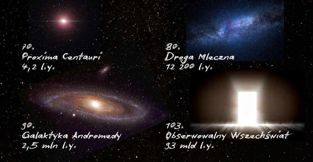 Idźmy dalej – liczby robią się tak abstrakcyjne, że nie ma sensu umieszczać ich w tabeli. 50 zagięć zaprowadzi nas w pobliże Słońca (150 mln km). Zginając kartkę 70 razy mijamy najbliższą gwiazdę spoza naszego układu, czyli Proxima Centauri (odległość 4,2 roku świetlnego, grubość kartki 12,5 roku świetlnego), 80 zagięć to rozmiar Drogi Mlecznej (czyli 12 200 lat świetlnych), a 90 to ilość pozwalająca znacznie przekroczyć odległość do najbliższej nam Galaktyki Adromedy (2,5 mln lat świetlnych, a grubość kartki to aż 12 mln lat świetlnych)!